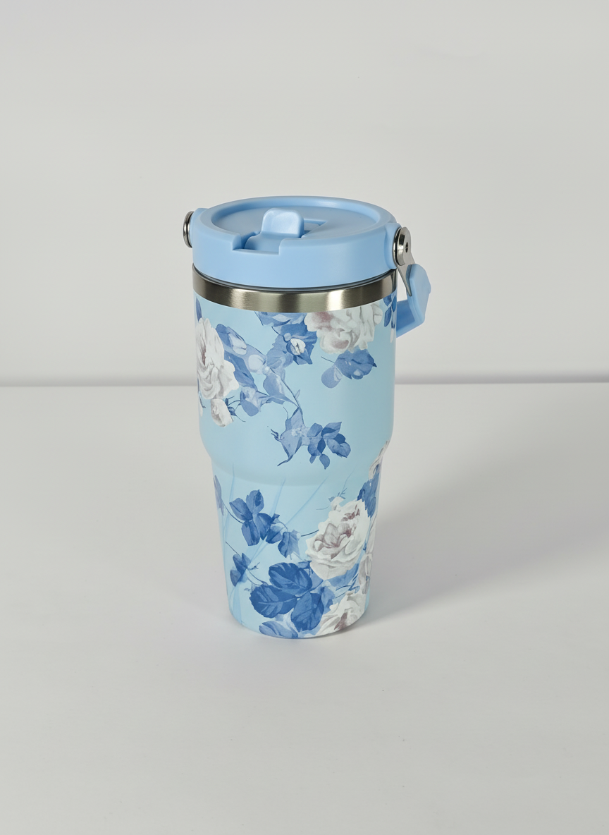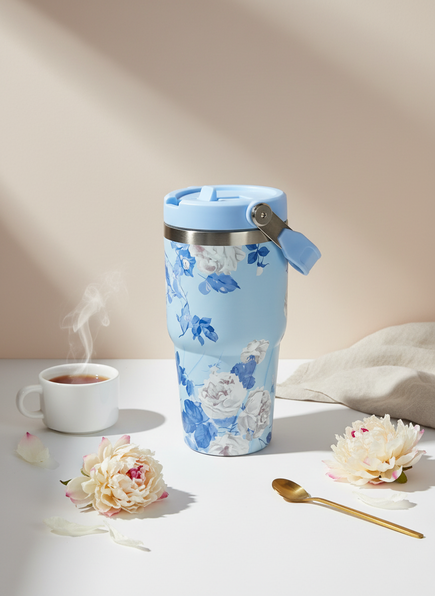 المج الحراري بتصميم الورد الأزرق – أناقة وعملية في كل مشروب