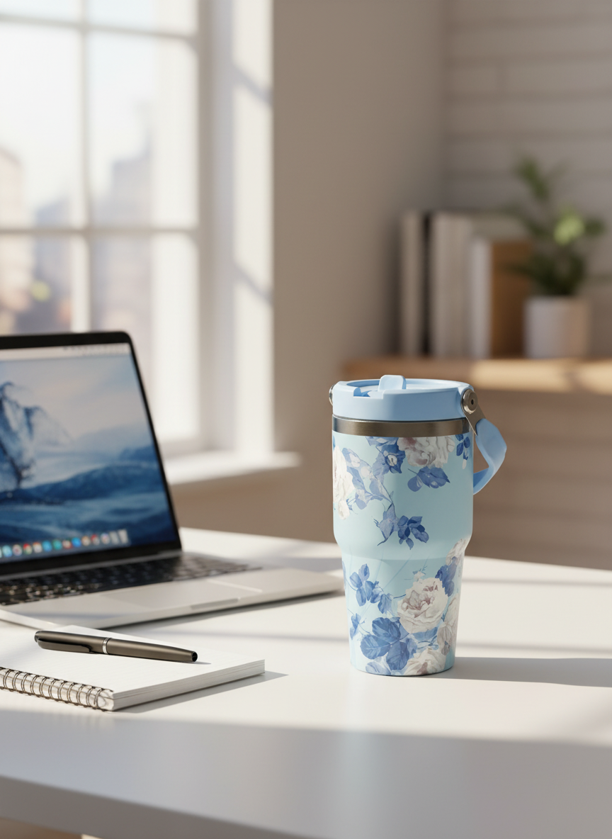 في النهاية، المج الحراري بتصميم الورد الأزرق مش مجرد كوب، لكنه قطعة عملية وأنيقة تكمّل يومك وتخلي مشروباتك دايمًا بدرجة الحرارة اللي تحبها.